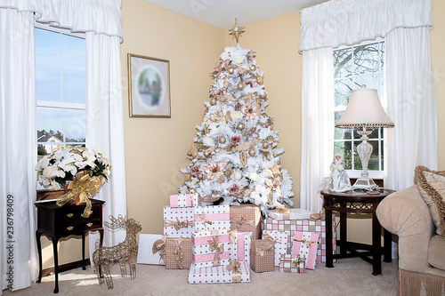 Christmas Tree With Pink And Gold Ornaments Stock Photo Alamy from c8.alamy.com